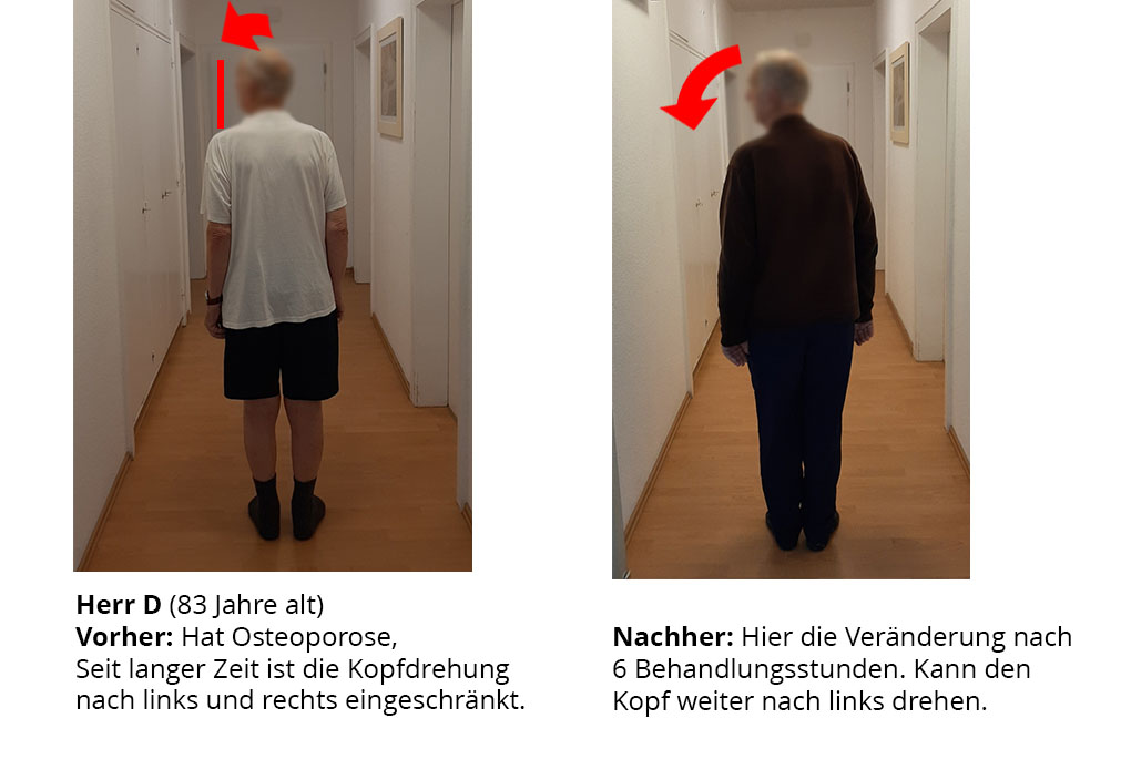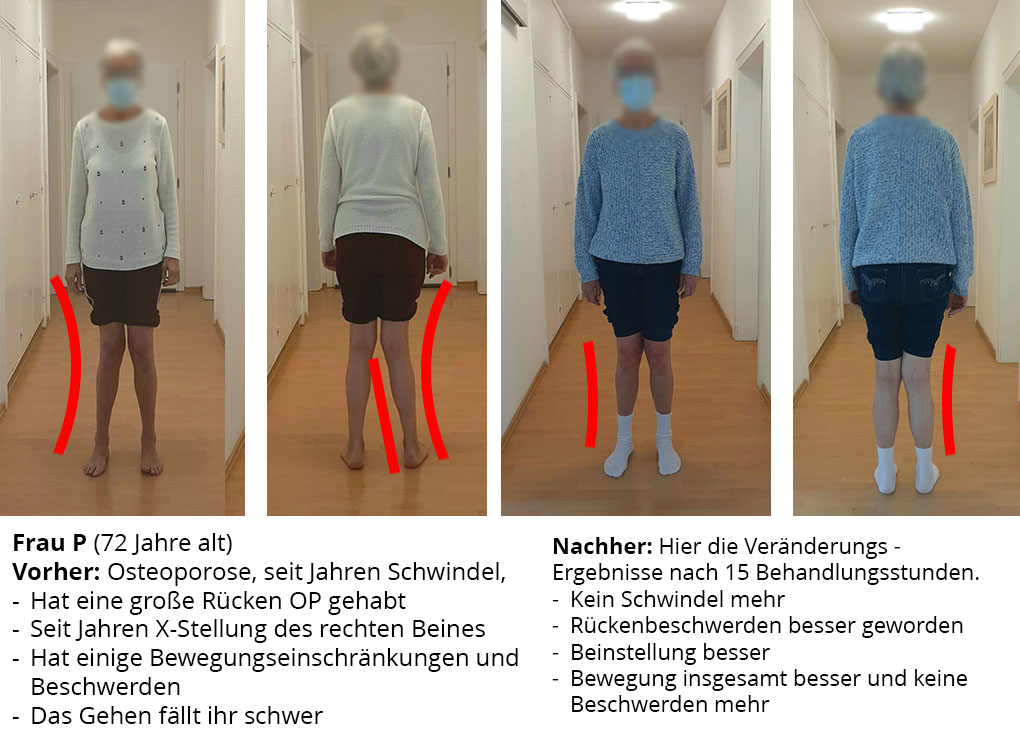 Frau P. sagt selbst, Sie hätte keine Rückenschmerzen mehr, ihre Bewegungen sind besser und fließender als vorher geworden. Sie kann jetzt besser nach vorne gucken beim Gehen.