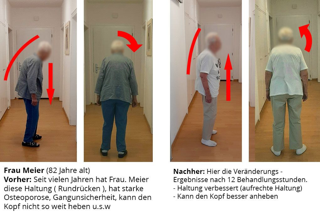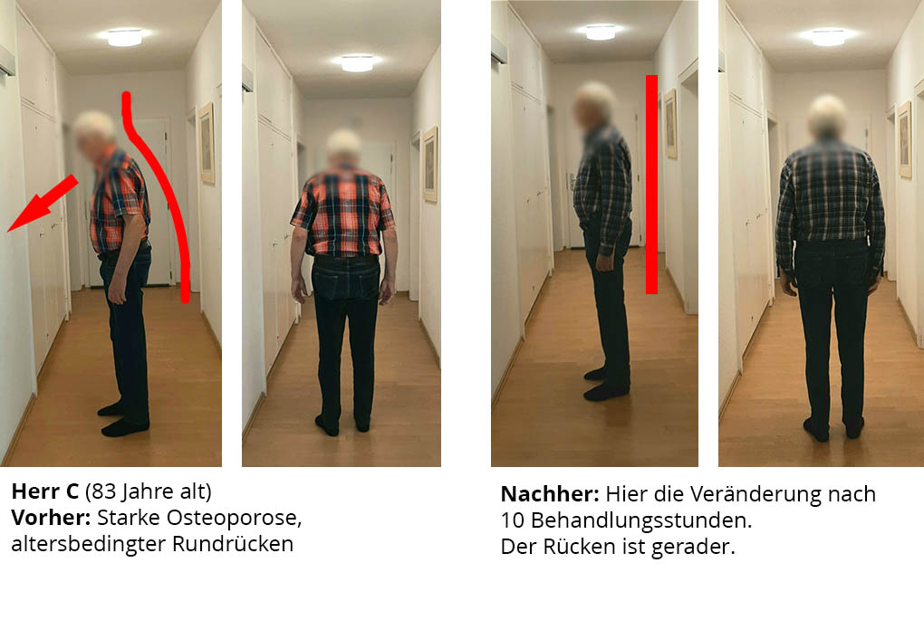 Nachher: Hier die Veränderungsergebnisse nach 10 Behandlungen: aufrechterer Oberkörper, keine Rücken- oder anderen Beschwerden mehr, deutlich bessere Beweglichkeit, tägliche Aufgaben fallen spürbar leichter