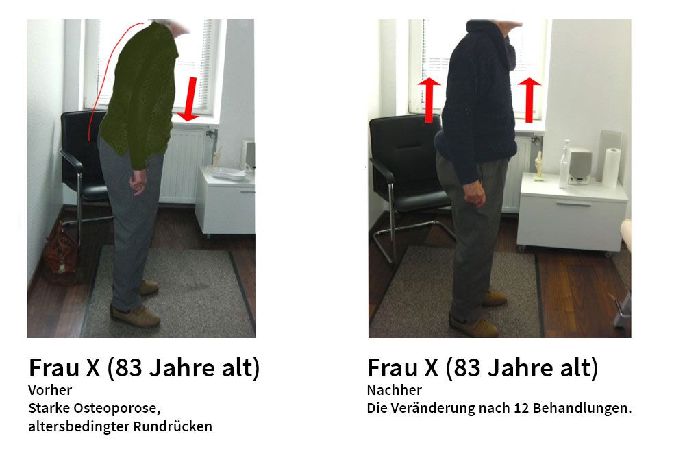 Nachher: Hier sehen Sie die Veränderung nach nur 10 Behandlungen mit unserer speziellen Therapiemethode. Trotz ihres hohen Alters und der bestehenden Osteoporose hat sich ihre Wirbelsäule deutlich aufgerichtet.
