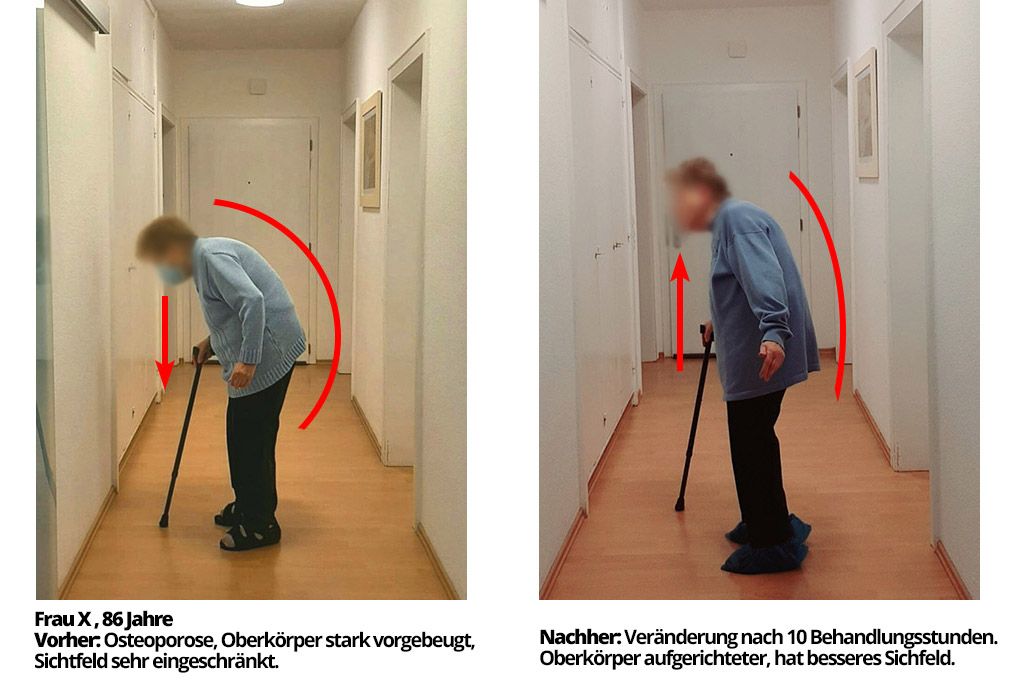 Rechts (nachher): Oberkörper wider Aufrechter nach 12 Behandlungsstunden